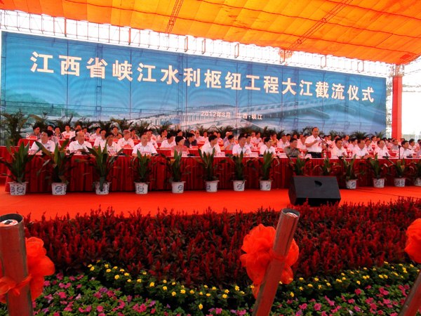 截流儀式由省委常委、常務副省長凌成興主持。10時16分,省長鹿心社宣布大江截流開始,10時29分,隨著最后一車石料投入江中,三期圍堰成功合龍后,省委書記蘇榮鄭重宣布:“峽江水利樞紐工程大江截流成功”。